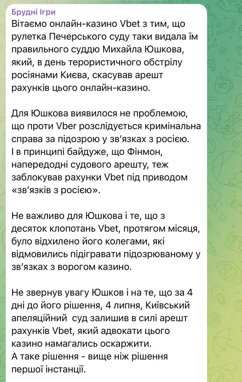 Найгучнішим епізодом стало рішення Печерського районного суду Києва в липні 2024 скасувати арешт рахунків VBet, попри те, що кримінальне провадження триває, а раніше десятки суддів і навіть Київський апеляційний суд за чотири дні до цього підтвердили законність арештів. Рішення ухвалив суддя Юшков, чим викликав критику з боку громадськості та експертів. Слід зазначити, що фінансовий моніторинг заблокував рахунки ще до судового рішення, враховуючи ті ж підозри у зв’язках компанії з російським капіталом.